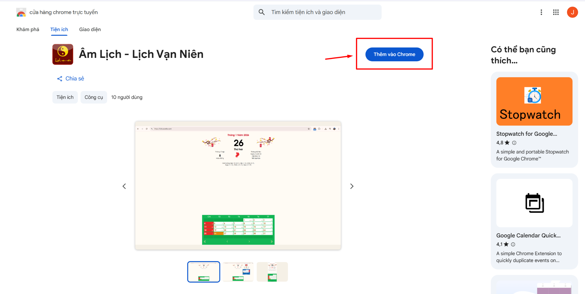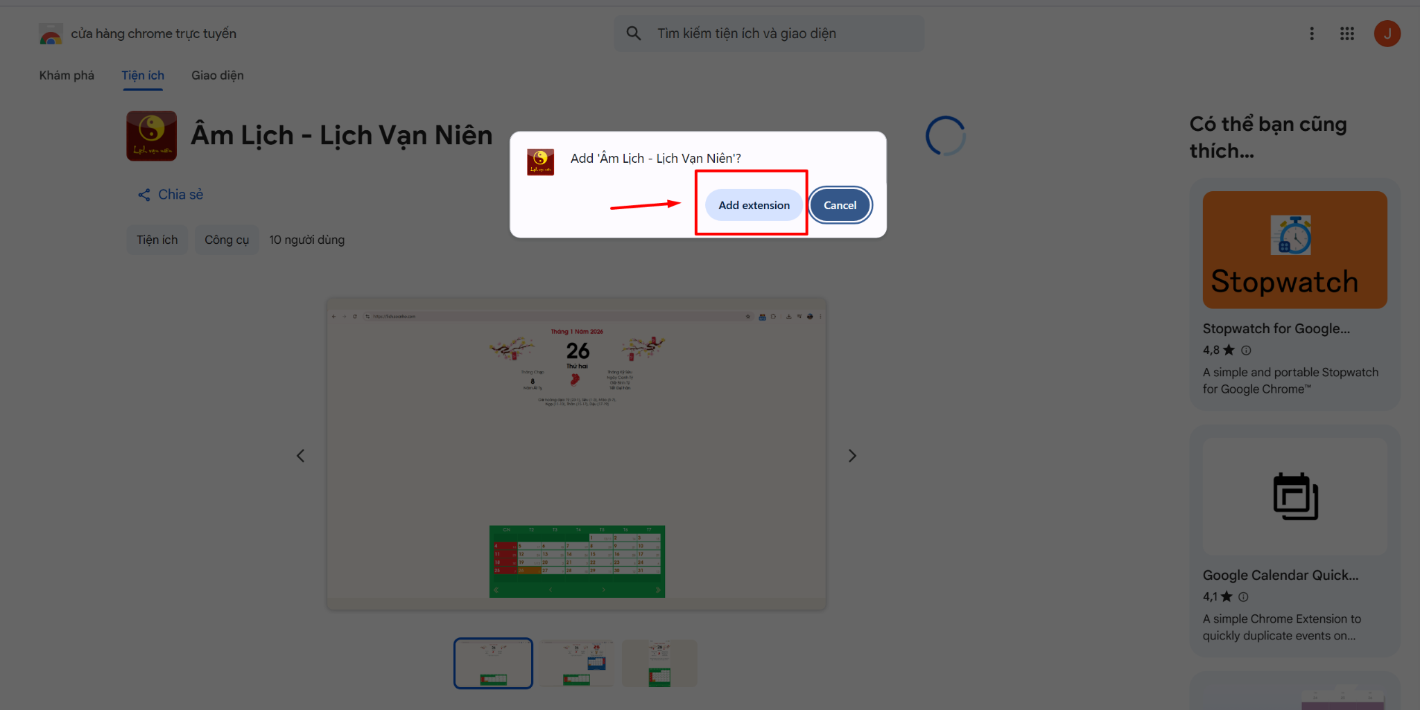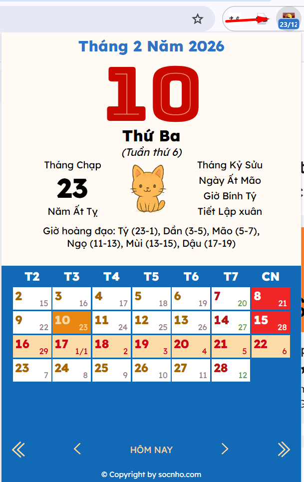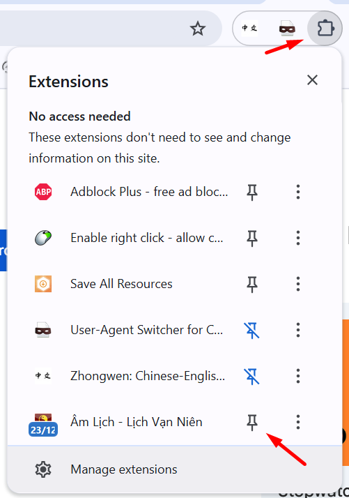 Nhấn biểu tượng 🧩 → ghim Lịch Vạn Niên.